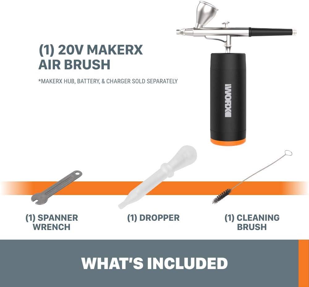 The Worx MAKERX Air Brush is more nimble than other air brushes, due to its slim form factor. But because it’s backed by a 20V battery, it’s actually more powerful, and lasts longer on a single charge. There’s no need for an air compressor, it’s just your MAKERX Air Brush and the Hub going where you go. With its precision 0.4 mm nozzle, it excels at fine, detailed jobs, like tiny crafts of all kinds. Its pressure rating is 14-18psi, and the dual function trigger controls its 7 L flow capacity. It comes with a dropper, spanner wrench, and cleaning brush in the box. MAKERX has created crafting and hobby tools that are smaller, but more powerful—the secret lies in the Hub. It’s a power source that you can take with your tool, so if you want to work in the middle of a large space, you can, and still have the power to get the job done. Thoughtful design allowed Worx engineers to make these tools slimmer, so you can hold them with more precision, and provide a level of detail to your projects that’s not possible with other tools. This model doesn’t come with the MAKERX Hub or a 20V Power Share battery, but that’s by design. Because if you already have a Hub and a battery, there’s no need to buy it again. It’s a great way to save money as you build up your MAKERX tool collection.