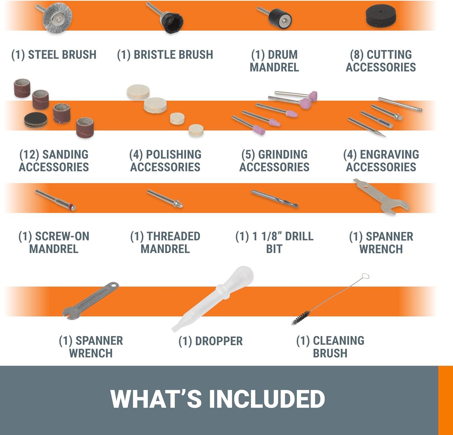 [UNIVERSAL FIT] The Rotary Tool accepts standard bits of all brands. So, you can pop over to your local hardware store whenever you need a replacement. But this kit comes with the most common accessories to get you started