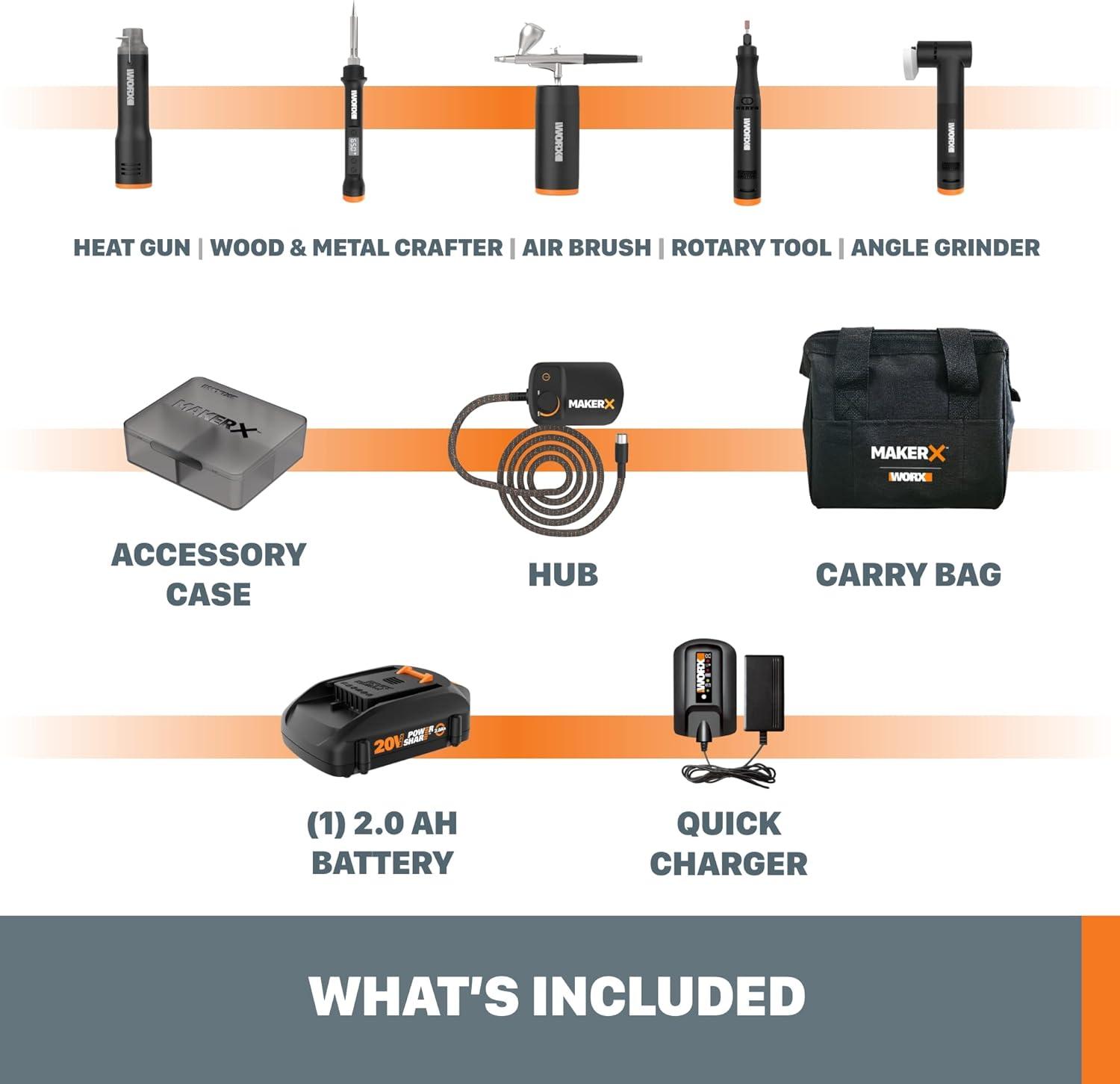 Worx MAKERX WX992L 20V 2pc Crafting Tool Combo Kit – Rotary Tool + Air Brush(MAKERX(5) PC Crafting Tool Deluxe Combo)