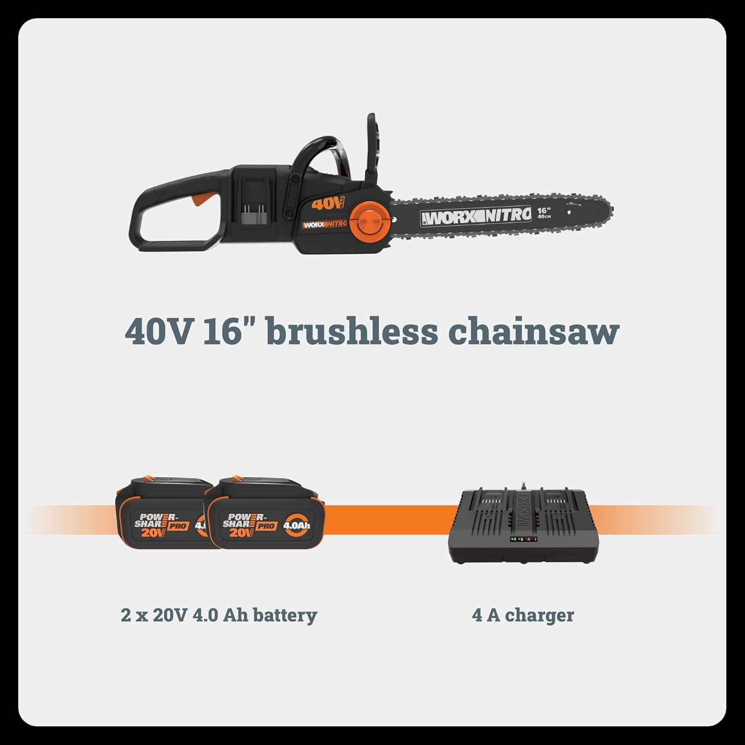 Worx Nitro 40V 16″ Cordless Brushless Chainsaw 4.0 Ah Battery and Charger Included WG385(Chainsaw)