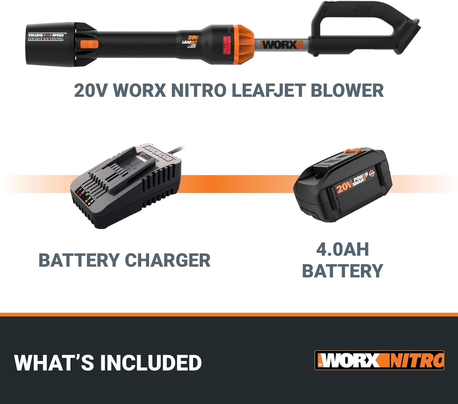 WORX Nitro WG543 20V Cordless Leaf Blower, Electric Blower with 410CFM & 130MPH, Blowers for Lawn Care with 3.8 Lbs, Battery & Charger Included(410CFM 20V Blower w/(1)4.0 Ah Battery)