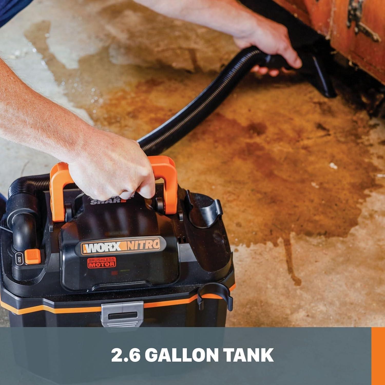 The Worx NITRO 20V Power Share PRO 2.6 Gal Cordless Wet/Dry Vacuum is part of the NITRO Series of powerful battery-operated tools, engineered for greater performance and run time. When paired with Power Share PRO high-capacity batteries, NITRO tools offer at least 2X the run time of standard 2.0Ah batteries. This NITRO cordless wet/dry vac offers 17 kPa of powerful suction, thanks to its high-efficiency brushless motor, and is ideal for cleaning up the jobsites of professional contractors. Made to take on wet and dry messes both large and small with its 2.6 Gal tank, High/Low suction settings, and onboard crevice tool and wide nozzle. When not in use in a professional setting, it has the flexibility and attachments to clean in-between seats and consoles in the car or for cleaning around the home. The 6.5 ft. flexible hose provides enough reach to make those tasks easy to do. While the compact, lightweight design and included shoulder strap make it comfortable to use, even across large areas.