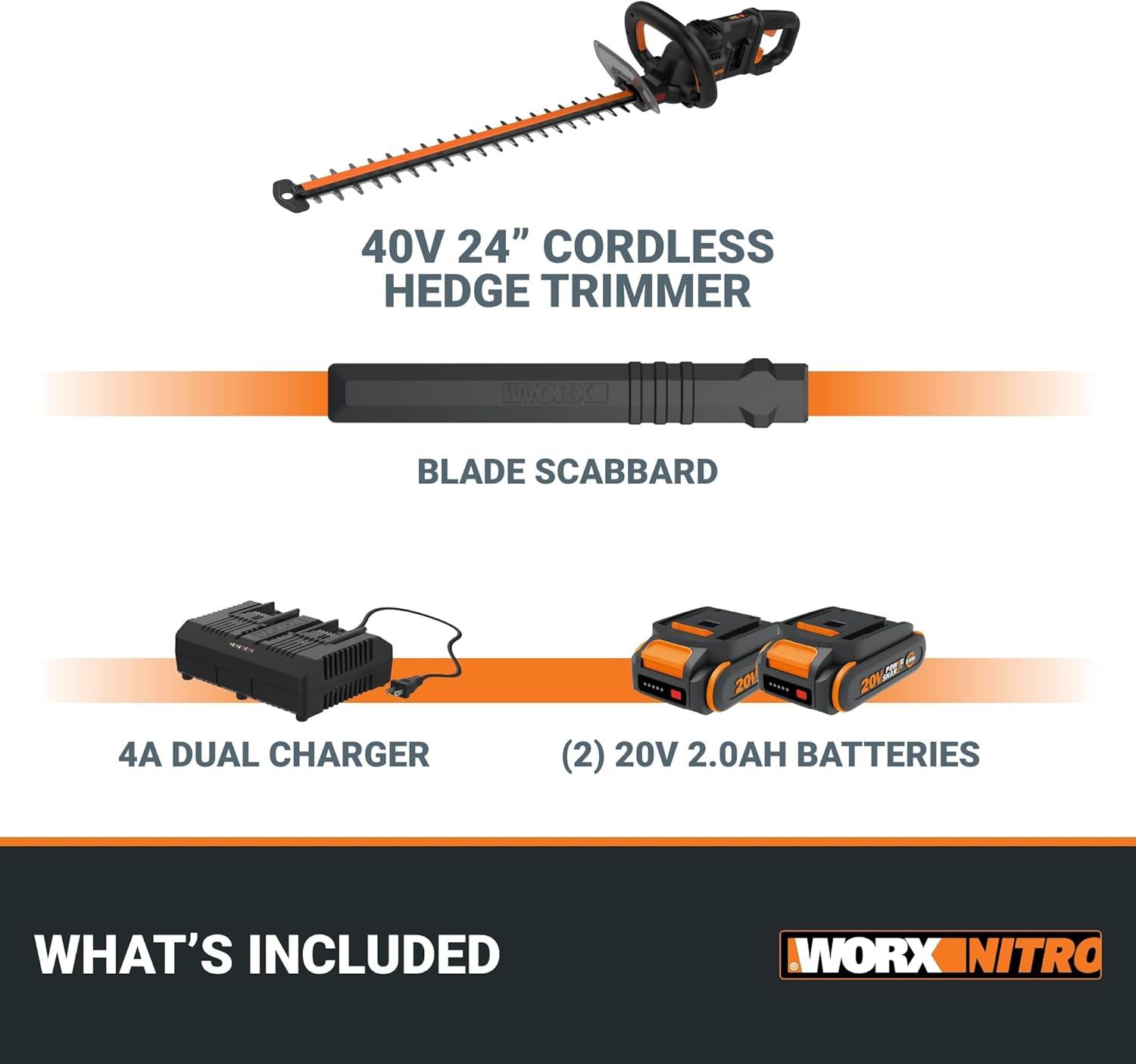 WORX WG261.9 22″ 20V Cordless Hedge Trimmer, Battery & Charger Not Included(24″ 40V Hedge Trimmer w/(2)2.0Ah Batteries)
