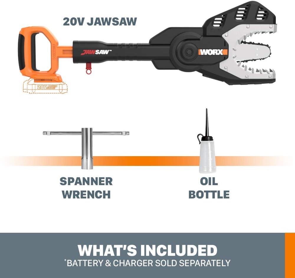 The WORX WG320.9 cordless lithium powered JawSaw does a little bit of everything. Need to prune limbs; clear storm debris; or cut kindling for fire wood? The JawSaw has a unique design that lets you make cuts directly on the ground without kickback or damaging the chain. The JawSaw is the safe and easy way to tackle debris clean up without gas, cords, or dangerous kickback. It is the perfect go-to tool for gardeners, handymen and anyone else who performs limb and brush clearing. THIS IS A BARE TOOL ONLY AND DOES NOT COME WITH THE 20V BATTERY OR CHARGER. THE WG320.9 WORKS WITH WORX 20-VOLT BATTERIES.
