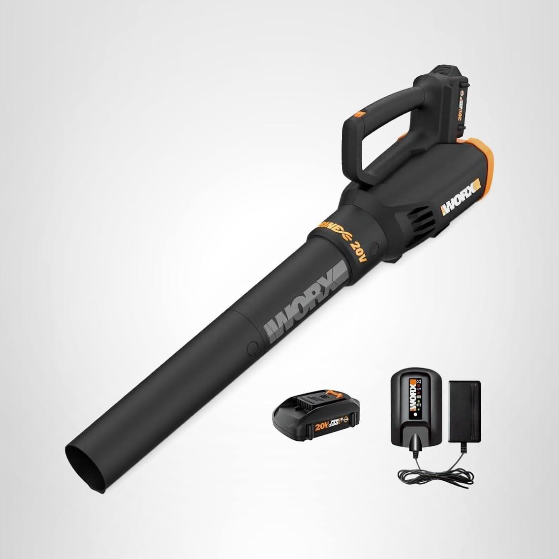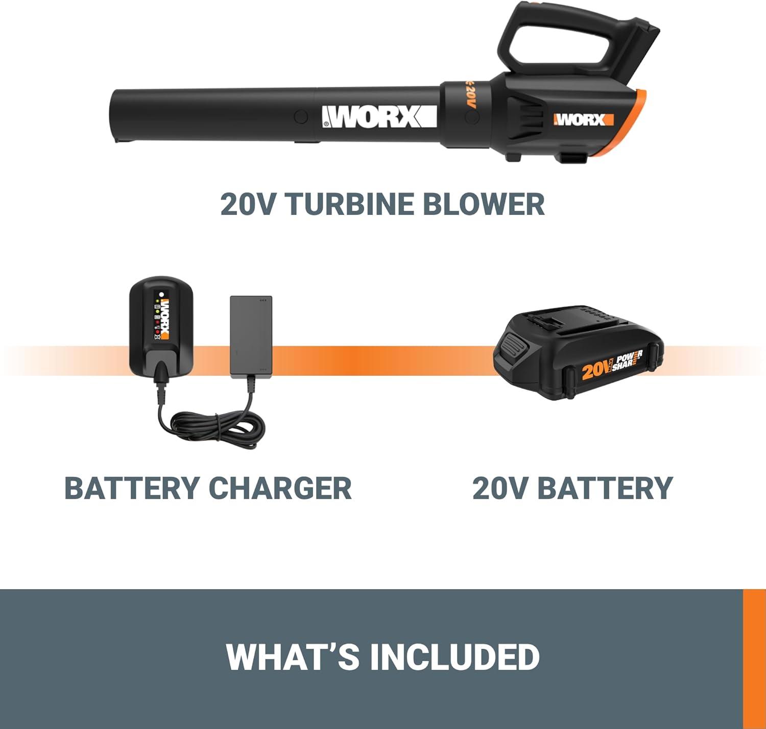 WORX WG547.9 20V Cordless Leaf Blower, Electric Blower with Turbine Fan, Blowers for Lawn Care with 2 Speed Control, Battery & Charger Not Included(360CFM 20V Blower w/(1)2.0 Ah Battery)